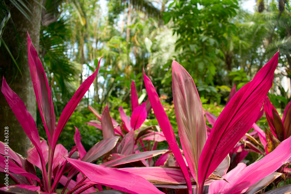 Tropical Garden With Palms Pink Hawaiian Ti Plant Cordyline Rouge Stock Photo Adobe Stock